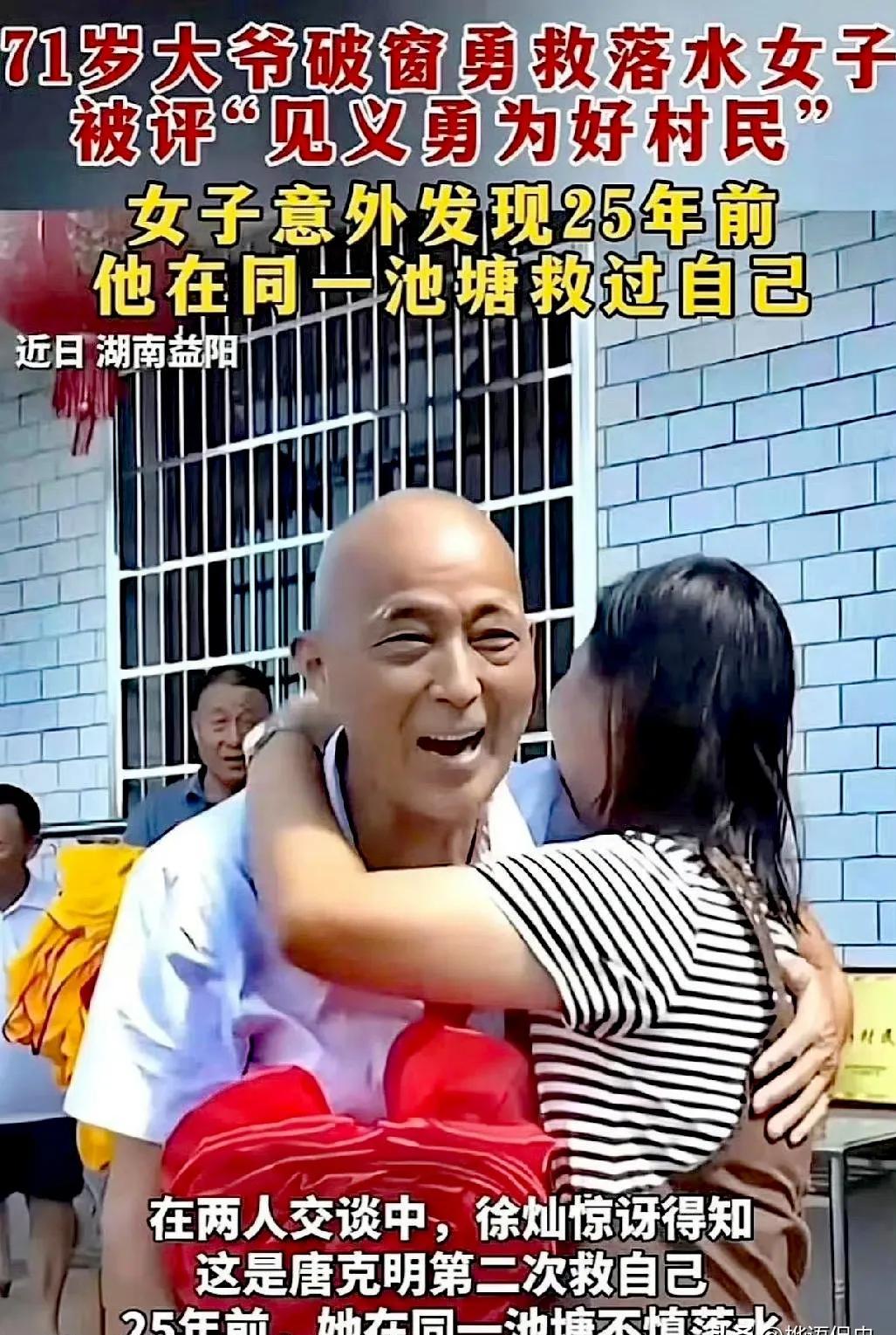 71岁的大爷跳河砸窗救人。事后女子登门拜谢,结果一聊大吃一惊,大爷竟然在25前,在同一个池塘救过自己!女子:她是我的再生父母,认他做干爹,给他养老。