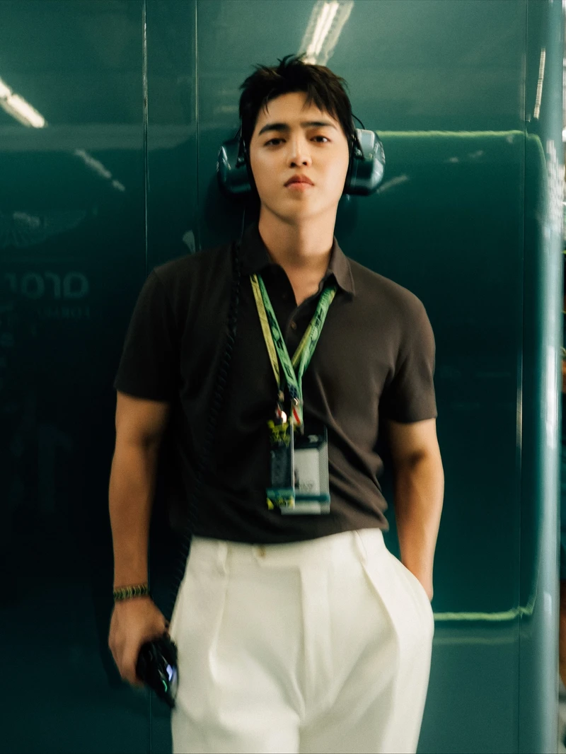 他身穿深色 Polo 衫搭配白色宽版长裤的造型亮相,将俐落线条与沉稳气场完美呈现。